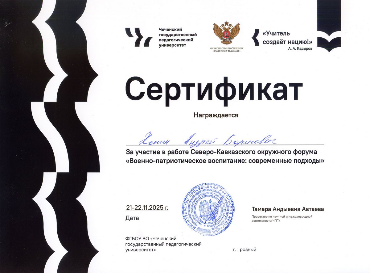 • казачий чин - "Сотник" объединённого Округа СКВРЗ ССКО "Станица Казанская" 17 апреля 2018 года; • образование высшее "Менеджер" государственного и муниципального управления, Российская академия народного хозяйства и государственной службы при Президенте Российской Федерации 18 декабря 2014 года; • награжден Архиерейской Грамотой митрополита Ставропольского и Невинномысского Кирилла, председателя Синодального комитета по взаимодействию с казачеством 15 июня 2015 года; • награжден Почетной Грамотой Губернатора Ставропольского края от 11 августа 2014 года; • лауреат городского фестиваля педагогического мастерства в номинации "Методический калейдоскоп-2022" с мастер-классом "Активная самооборона от нападения в школе"; • лауреат педагогического фестиваля "Талант-2008" в номинации "Педагог-мастер" с презентацией "Айкидо - искусство мира"; • начальник отдела по физической подготовке Ставропольского станичного общества "Станица Казанская" с 9 апреля 2014 года; • помощник Председателя Отдела по духовно-физическому воспитанию молодежи Ставропольской и Невинномысской епархии с 9 октября 2012 года по 2018 год; • судья по спорту Первой категории с 5 марта 2003 года; • тренер высшей категории от 21 августа 2002 года; • "Мастер спорта России" по айкидо с 15 февраля 2002 года; • "Кандидат в мастера спорта России" по айкидо с 26 июня 2000 года; • педагог дополнительного образования высшей категории подтверждено 5 апреля 1999 года, 6 ноября 2007 года, 29 ноября 2012 года, 5 февраля 2018 года; • образование высшее, психолого-педагогическое с 1999 года; • высшая категория учителя физической культуры с 1998 года; • членство во Всемирном центре Айкикай Хомбу Додзё с 1995 года; • подготовил более 50 мастеров, аттестованных на черный пояс айкидо от 1-го до 5-го данов; • организовал 57 семинаров Ставропольского края по айкидо; • участник 60 международных семинаров по айкидо под руководством: Моритеру Уэсиба досю, Мицутеру Уэсиба вака-сенсей, Абэ Сейсеки 10 дан, Коичи Бериш 10 дан, Нобуюки Ватанабэ 8 дан, Сейсиро Эндо 8 дан, Хироси Изояма 8 дан, Минору Канецука 7 дан, Секи Седзи 7 дан, Коичи Ториуми 7 дан, Тецутака Сугавара 7 дан, Сугино Сугавара 7 дан, Цурудзо Миямото 7 дан, Такекши Каназава 7 дан, Энтони Смиберт 7 дан, Тэрри Эзра 7 дан, Джорджио Венери 7 дан, Стефан Бенедетти 7 дан, Хироси Фудзимаки 6 дан, Таканори Курибаяси 6 дан, Хироси Онно 6 дан, Хаято Осава 6 дан, Мартин Грубер 6 дан, Михаэль Иберс 6 дан, Андреас Хендрик 6 дан, Стефан Стеннад 6 дан, Такаши Куроки 6 дан, Харуо Мацуока 5 дан, Ульрих Шюманн 5 дан, Любомир Врачаревич 1 дан. • участник обучающих семинаров по психотерапевтической кинезиологии (Ростов на Дону, Москва); психотерапии Символдрама (Ставрополь); телесно-ориентированной психотерапии по Вильгельму Райху (Невинномысск); остеопатии (Ростов на Дону); иглоукалывание (Ростов на Дону, Красноярск); традиционная китайская медицина (Красноярск); Юмэйхо терапия (Москва, Черкесск, Красноярск)